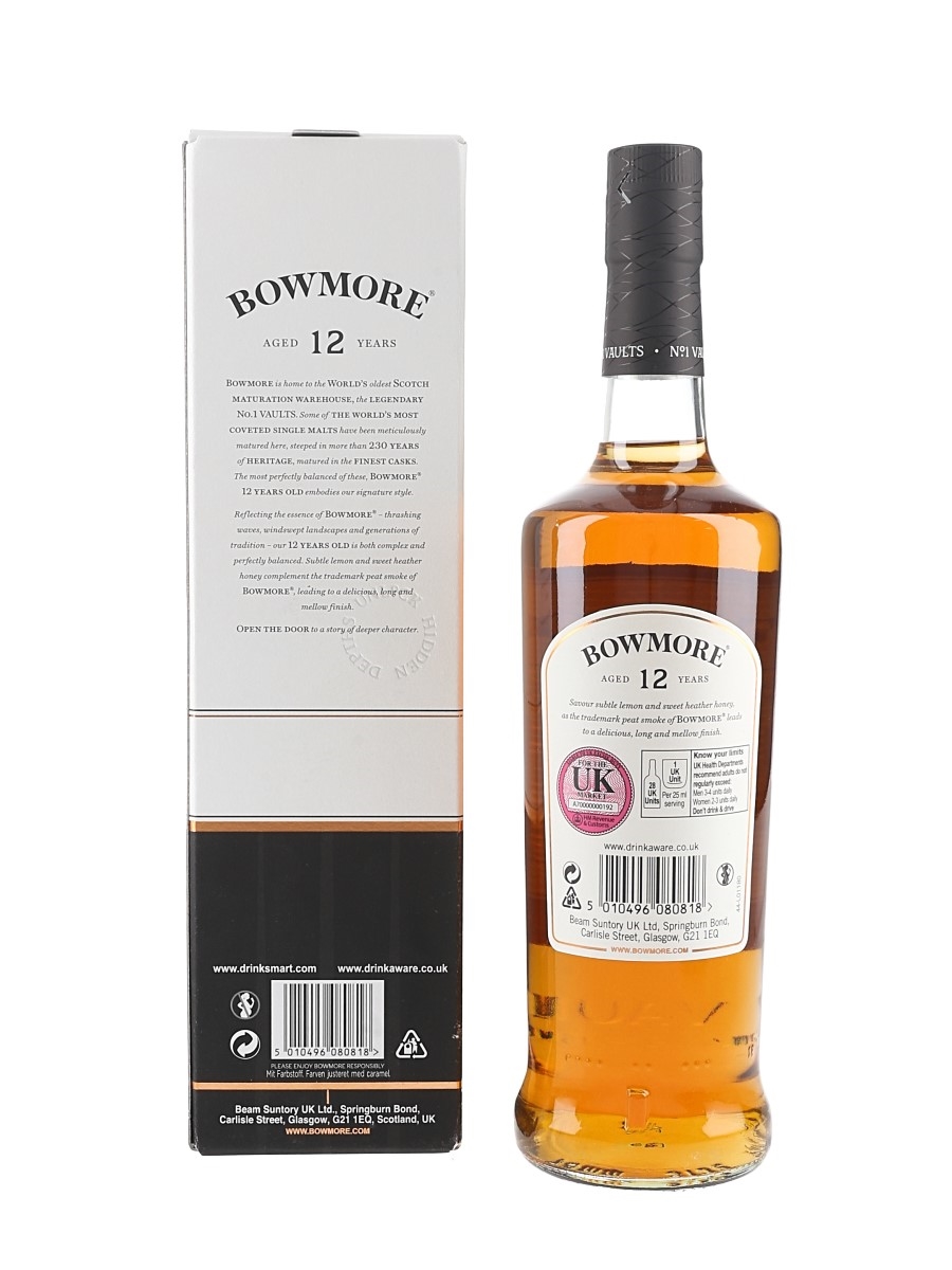 A bottle of Bowmore 12 Year Old Islay Single Malt Scotch Whisky.