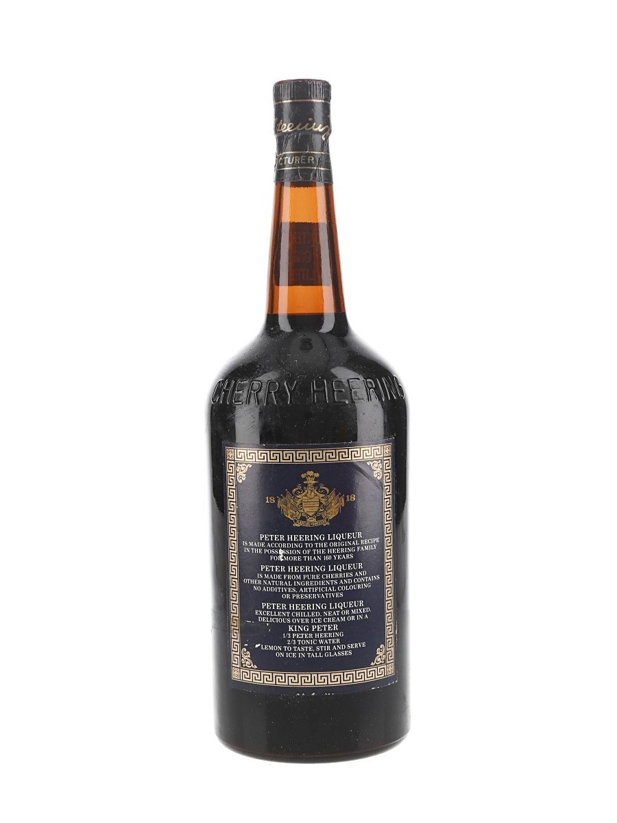 A litre bottle of Cherry Heering liqueur produced in Copenhagen, Denmark. We estimate this was bottled in the 1970s.