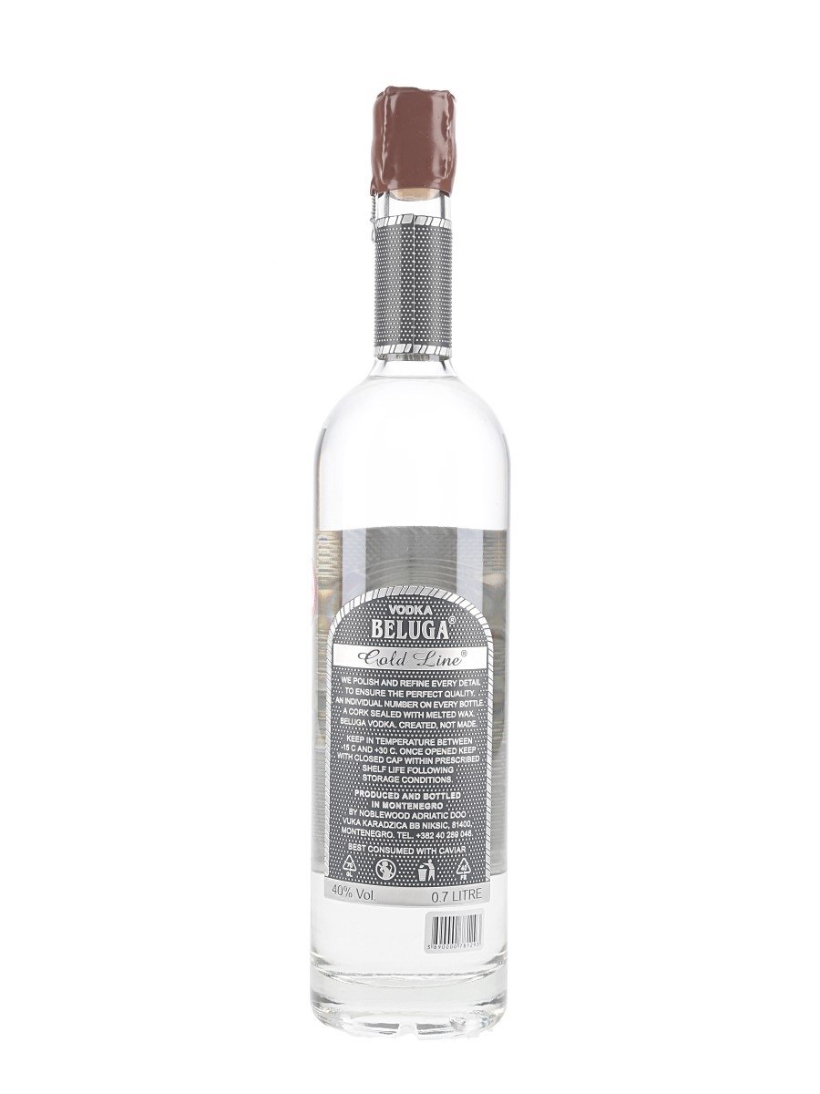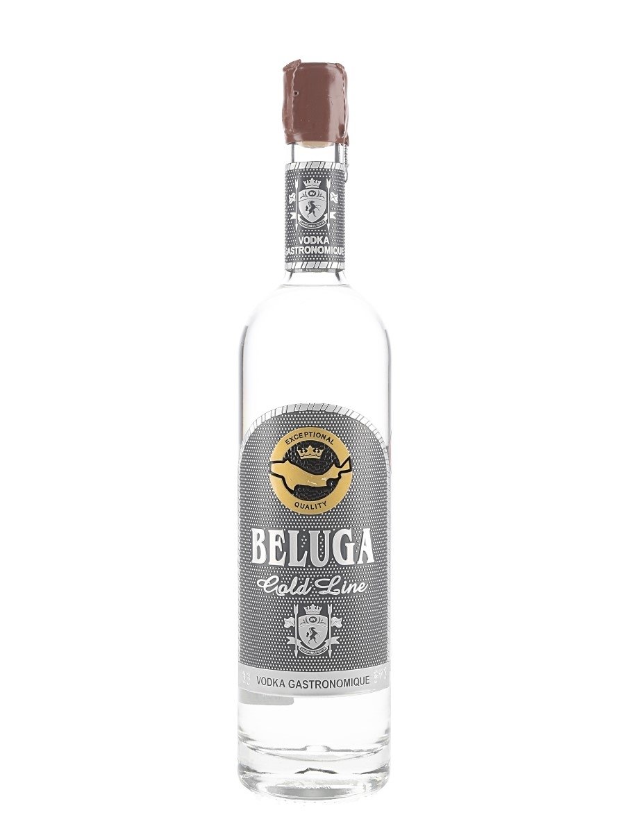 A bottle of Beluga Gold Line Russian vodka from Mariinsk distillery.