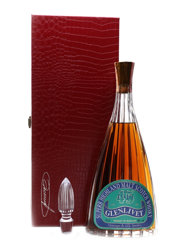 A bottle of Glenlivet 1940, 45 Year Old, from Italian independent bottler Sestante. This is presented in an Atlantis crystal decanter with stopper, inside a red presentation box.