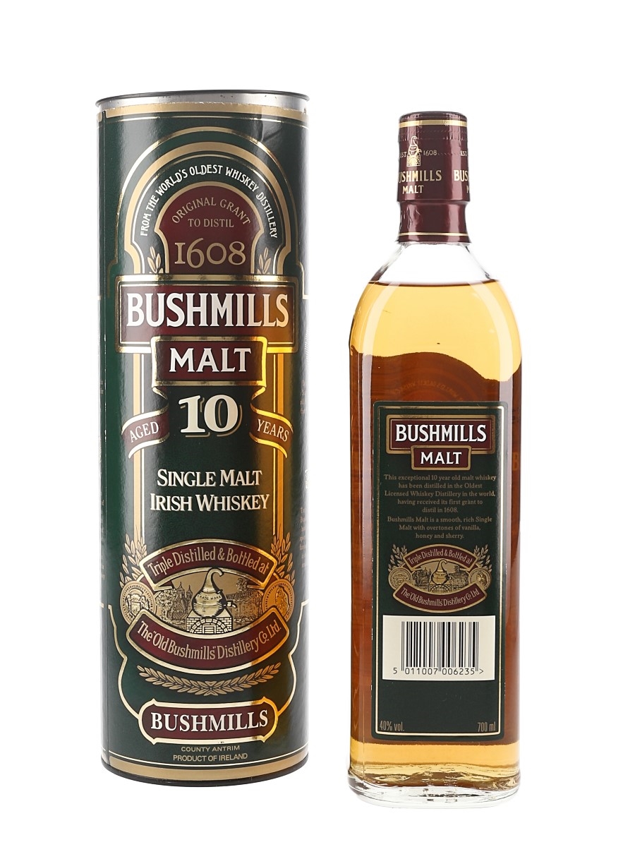 A bottle of Bushmills 10 Year Old Single Malt Irish Whiskey.