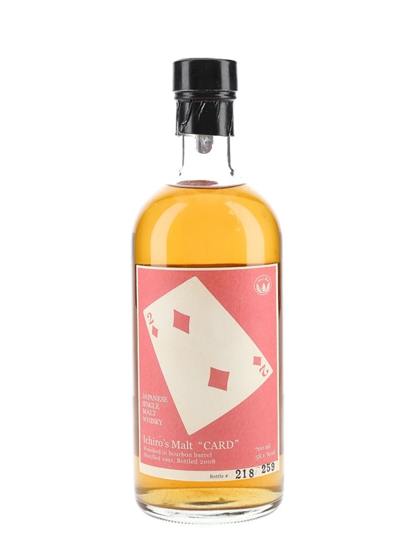 A bottle of Hanyu Japanese Single Malt Whisky, the Two of diamonds in the Ichiro's Malt Card series. This was distilled in 1991, finished in a Bourbon oak barrel before bottling at cask strength in 2008.