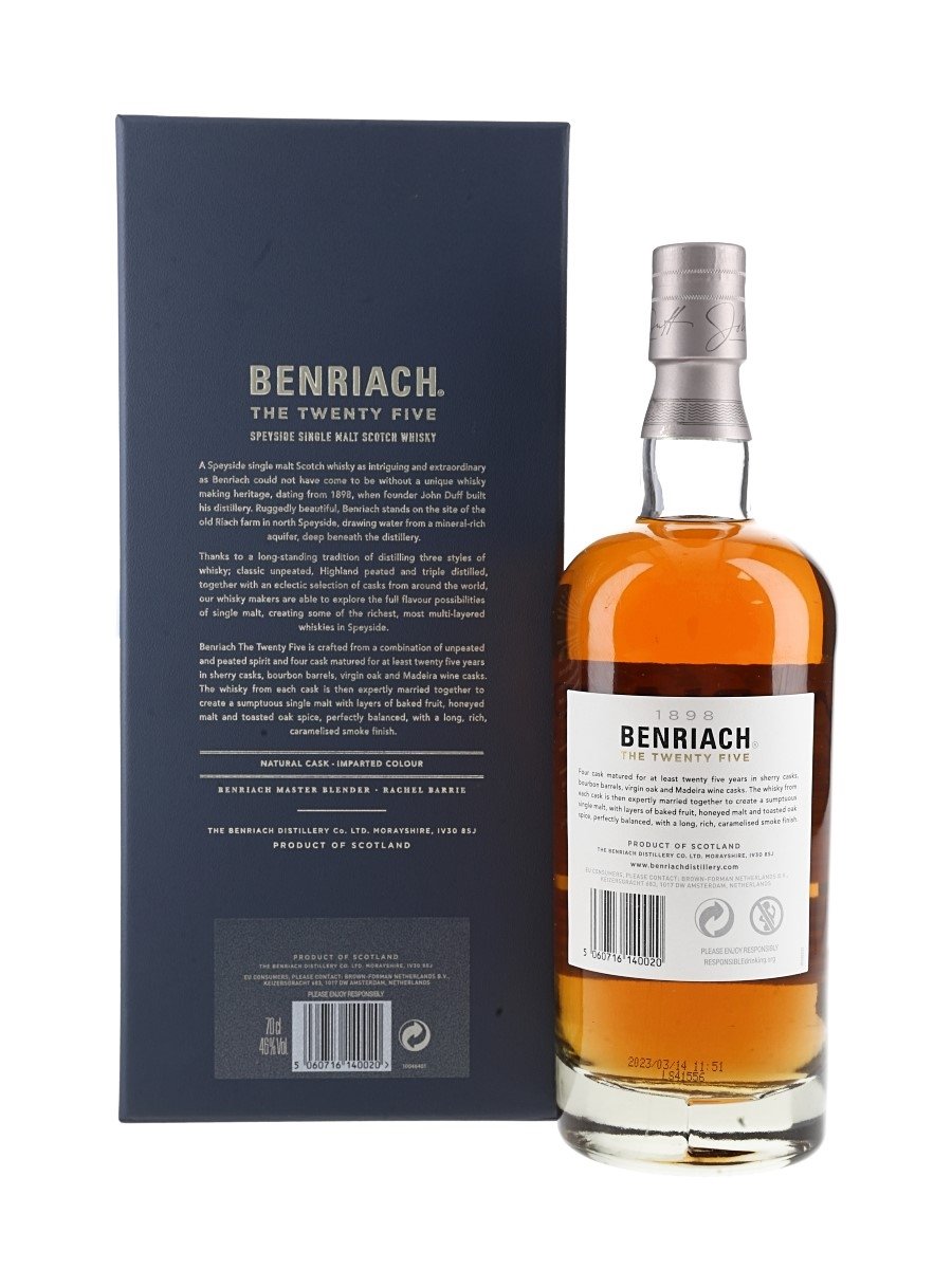 A bottle of Benriach 25 Year Old Single Malt Scotch Whisky. Matured in a marriage of Bourbon, Sherry, Virgin oak and Madeira Wine casks before being bottled on the 14th of March 2023.