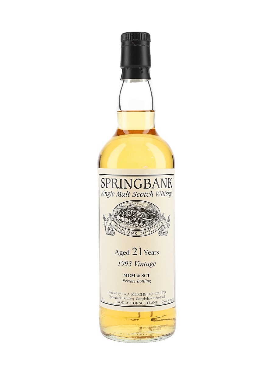 A bottle of Springbank 21 Year Old single malt Scotch whisky. This was distilled in 1993 and bottled at cask strength in 2014 for a private bottling. Please note ABV is not mentioned on the label.