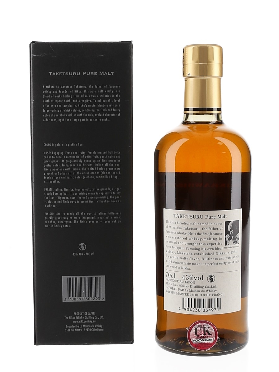 A bottle of Taketsuru Japanese Pure Malt Whisky. This was produced by Nikka Whisky Distilling and imported to France by La Maison du Whisky.