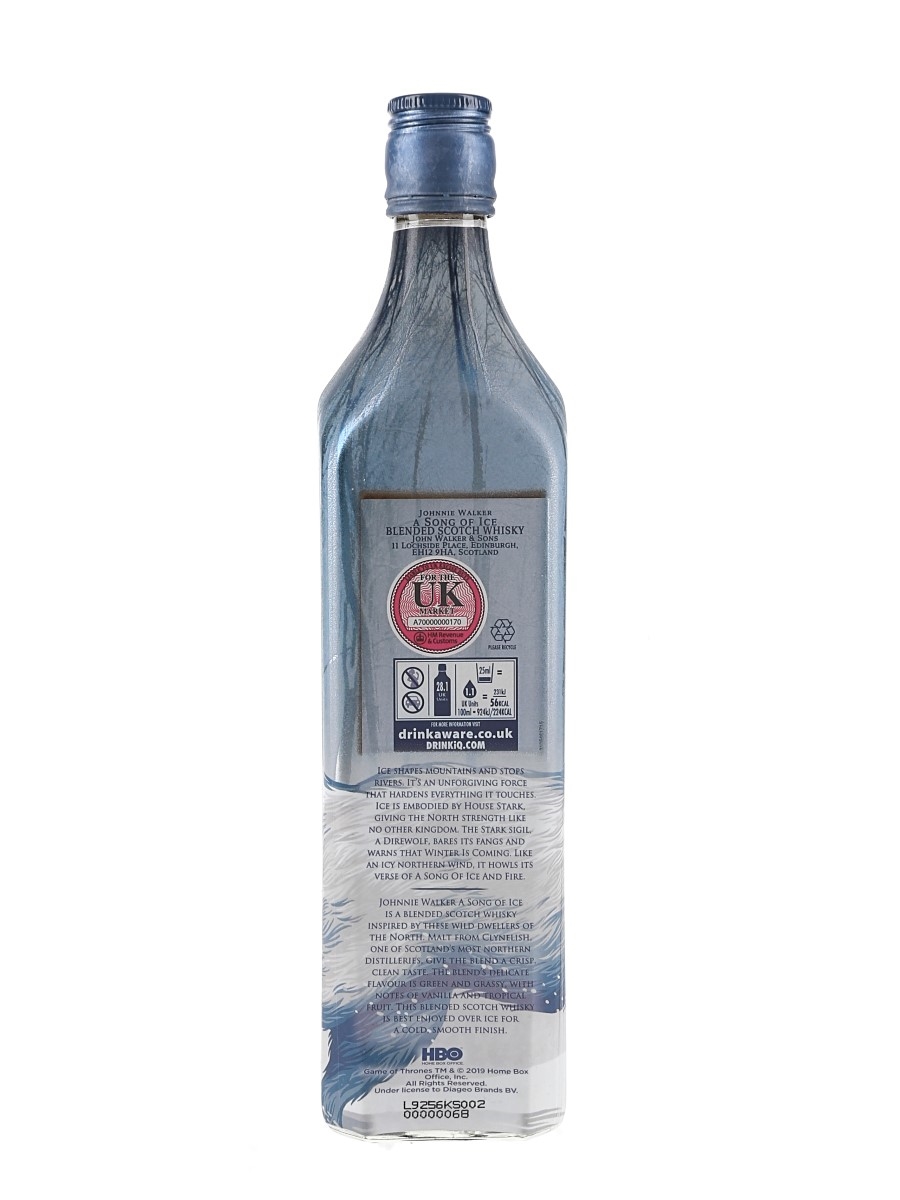 A bottle of Johnnie Walker Game Of Thrones Limited edition Blended Scotch Whiskies A Song Of Ice. This blend was inspired by the Game of Thrones series.