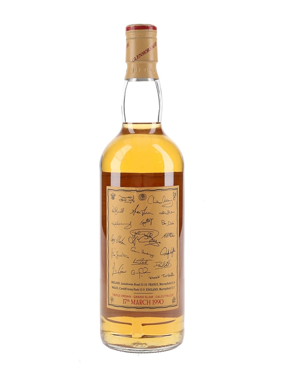 A bottling of Glenmorangie 10 Year Old Single Highland Malt Scotch Whisky. This was released to celebrate the Scottish rugby team's Grand Slam win on 17 March 1990.