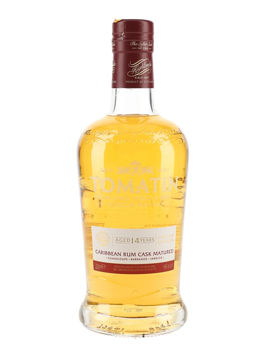 A bottle of Tomatin 14 Year Old Single Malt Scotch Whisky. This was matured in Caribbean rum casks and bottled 5 September 2024.