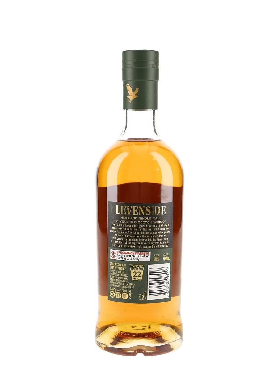 A bottle of Levenside 10 Year Old Highland Single Malt Scotch Whisky. This was matured in an American Oak Bourbon cask and bottled on 21 June 2023. This was produced for the Australian market.