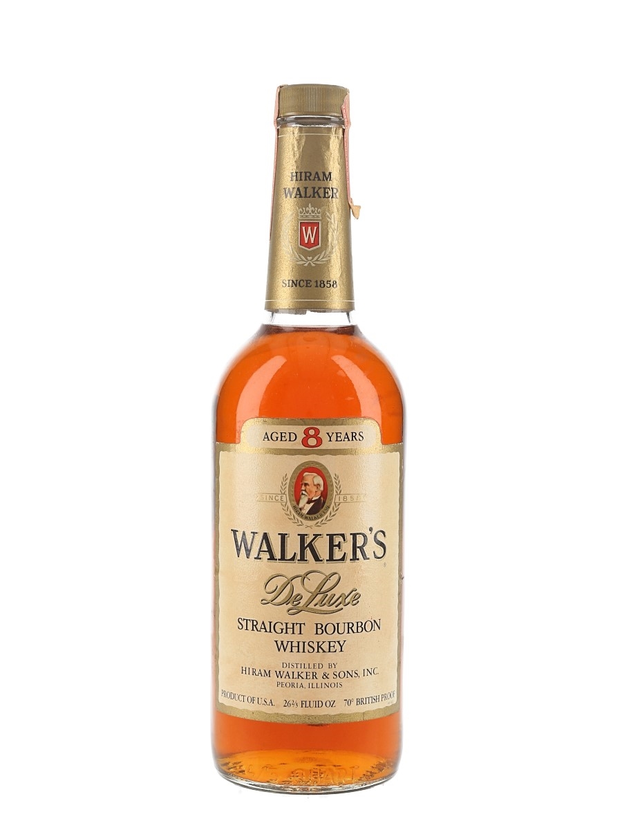 A bottle of Walker's Deluxe 8 Year Old Straight Bourbon Whiskey, distilled by Hiram Walker & Sons, Inc. Peoria, Illinois. We estimate this was bottled in the 1970s.