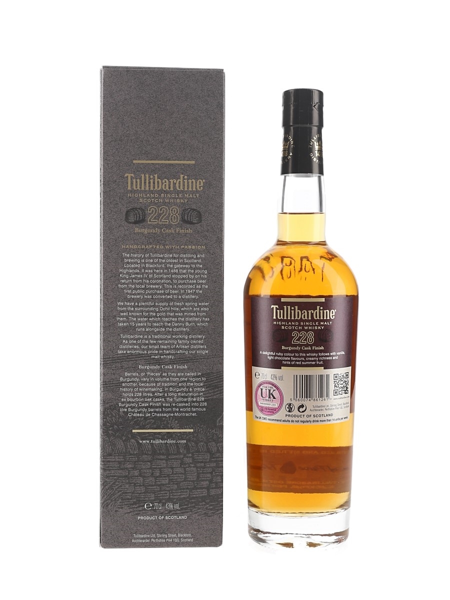 A bottle of Tullibardine 228 Highland Single Malt Scotch Whisky which spent its final maturation period in Burgundy wine casks.