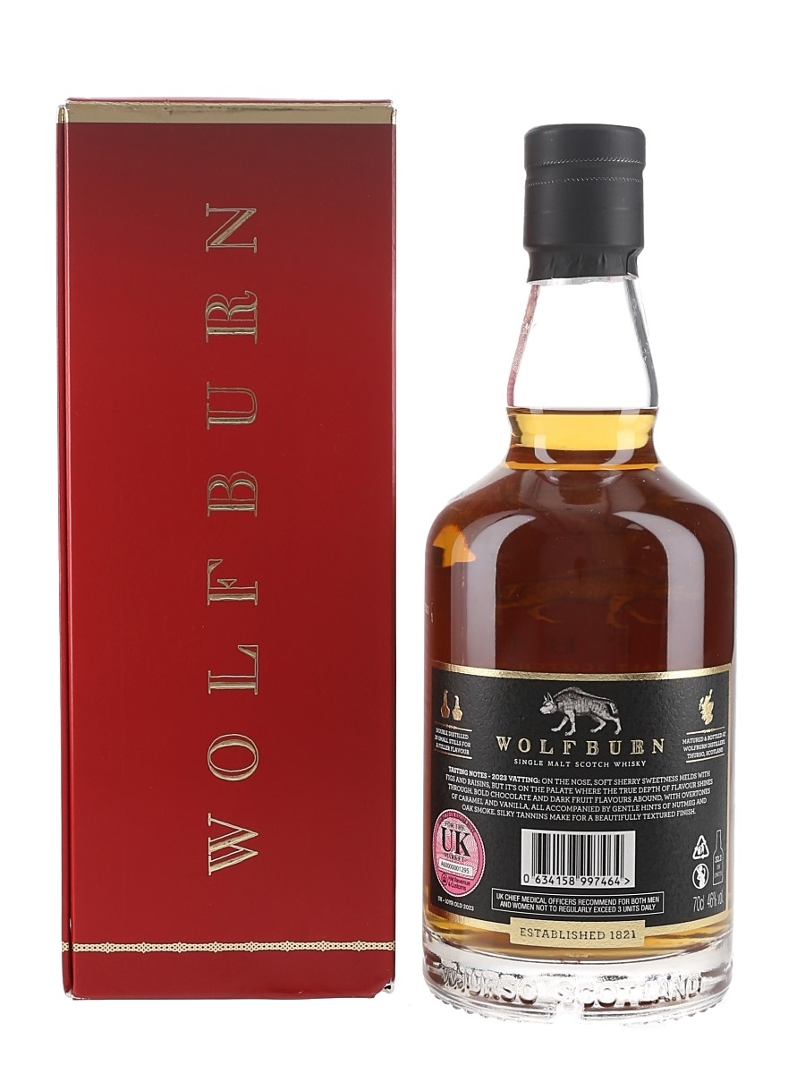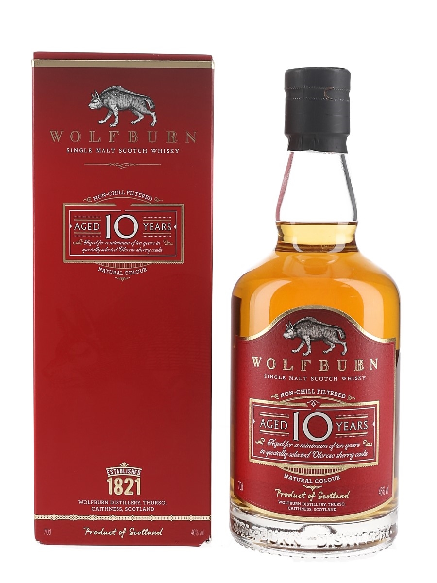 A bottle of Wolfburn Wolfburn 10 Year Old Single Malt Scotch Whisky. This was matured in Oloroso sherry casks before being bottled in 2023 .