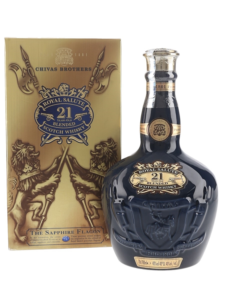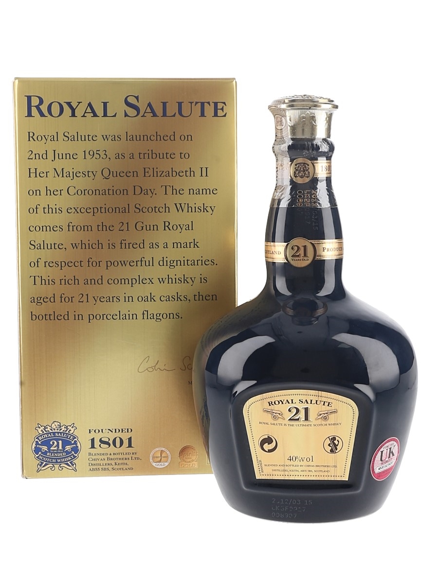 A bottle of Royal Salute 21 Year Old Blended Scotch Whisky produced by Chivas Brothers Ltd and presented in a blue ceramic decanter with the original velvet bag. The bottling code indicates that this was bottled on 15th March 2012