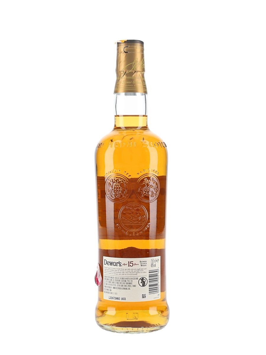 A bottle of Dewar's 15 Year Old Double Aged Blended Scotch Whisky produced by John Dewar & Sons Ltd.
