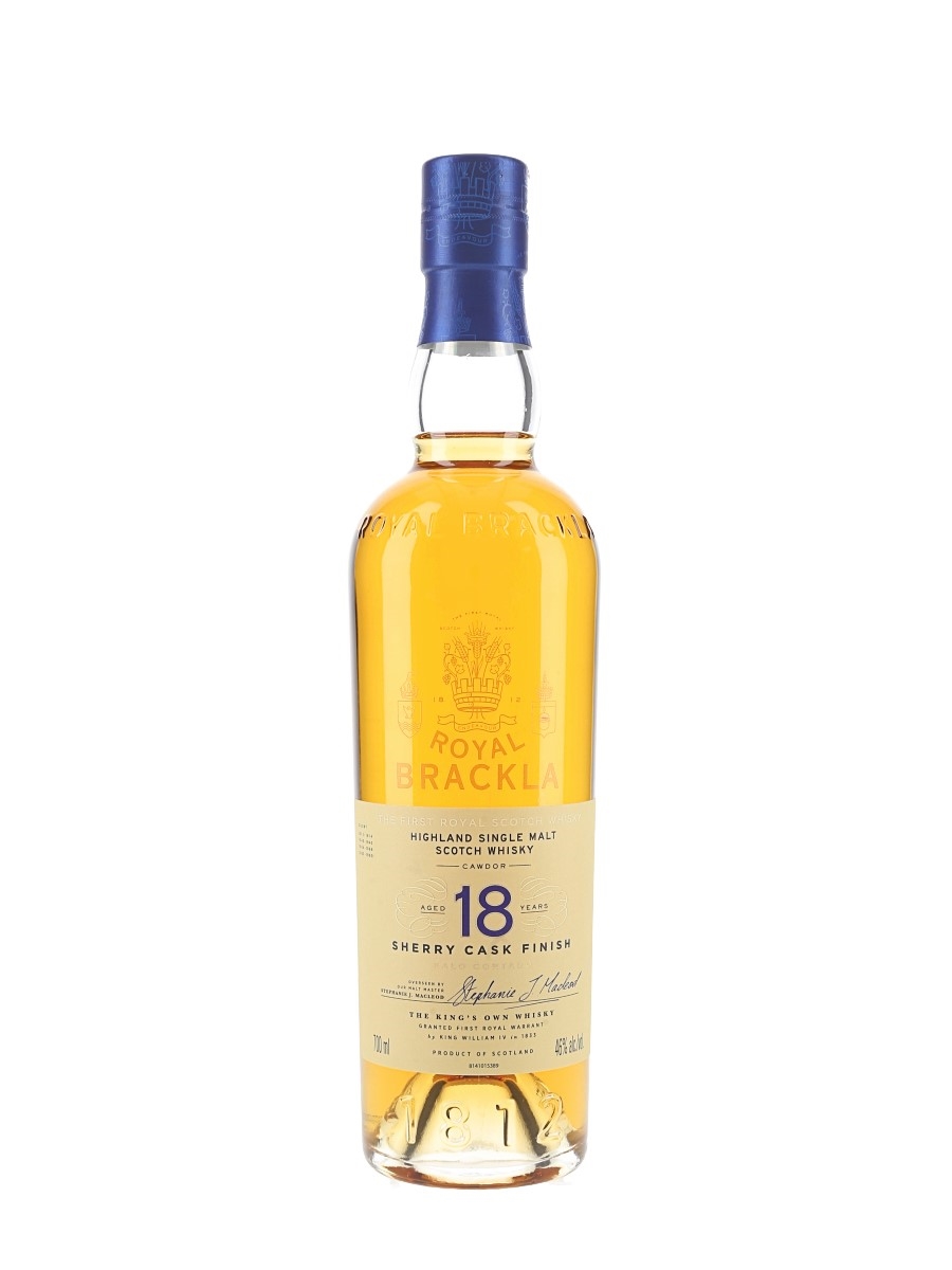 A bottle of Royal Brackla 18 Year Old Highland Single Malt Scotch Whisky, finished in Palo Cortado sherry casks.