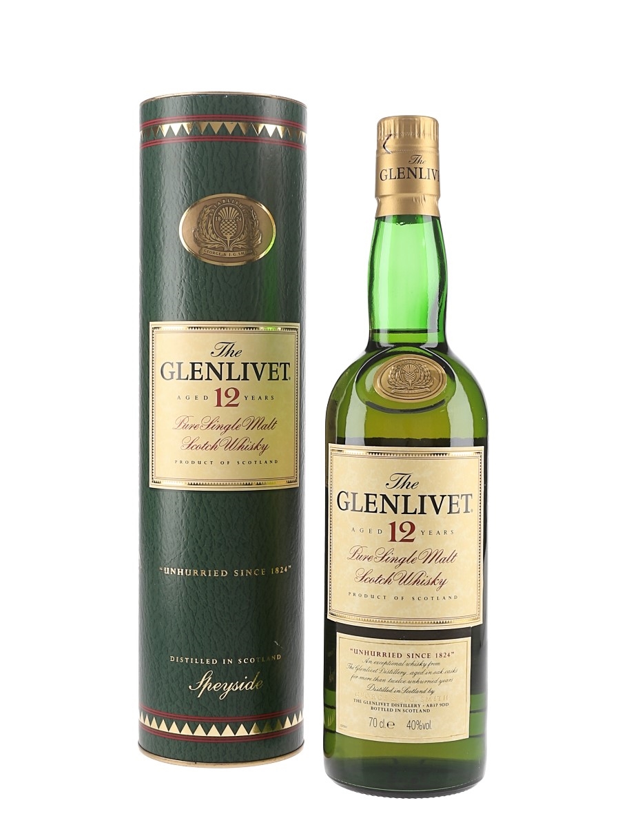 A bottle of The Glenlivet 12 Year Old Pure Single Malt Scotch Whisky. We estimate this was bottled in the 1990s.