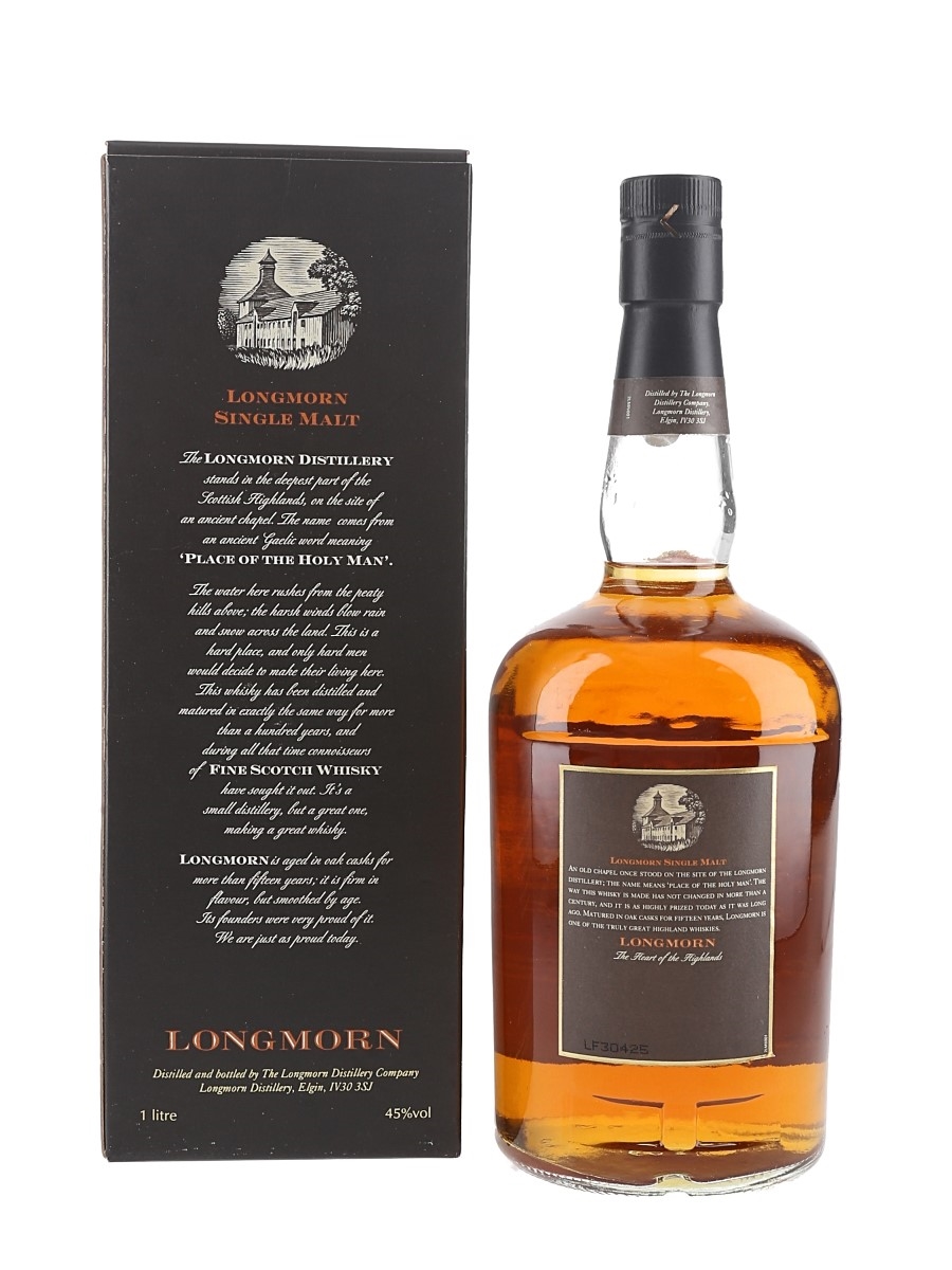 A litre bottle of Longmorn 15 Year Old Highland Single Malt Scotch Whisky.