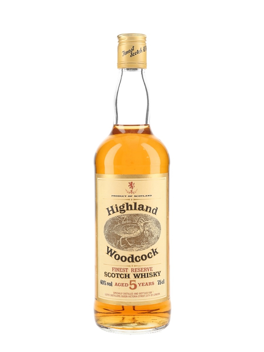 A bottle of Highland Woodcock 5 Year Old Finest Reserve Scotch Whisky specially distilled and bottled for Lloyd Distillers. We estimate this was bottled in the 1980s.