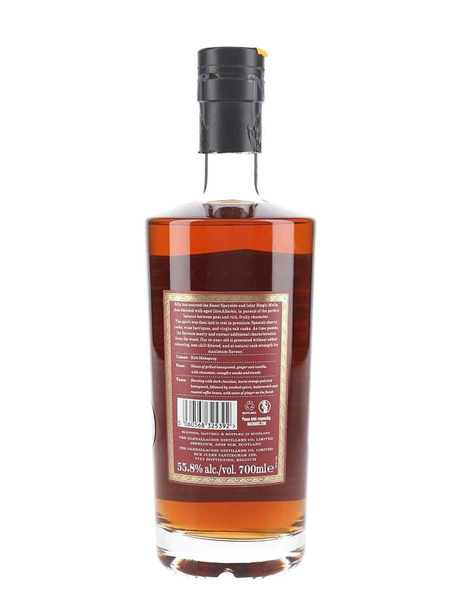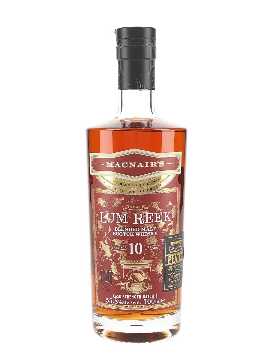 A bottle of MacNair's Lum Reek 10 Year Old Peated Blended Malt Scotch Whisky. This was matured in Spanish sherry casks, wine barriques, and virgin oak casks, and bottled at a cask strength of 55.8% ABV on 17 November 2022 by GlenAllachie Distillers Co.