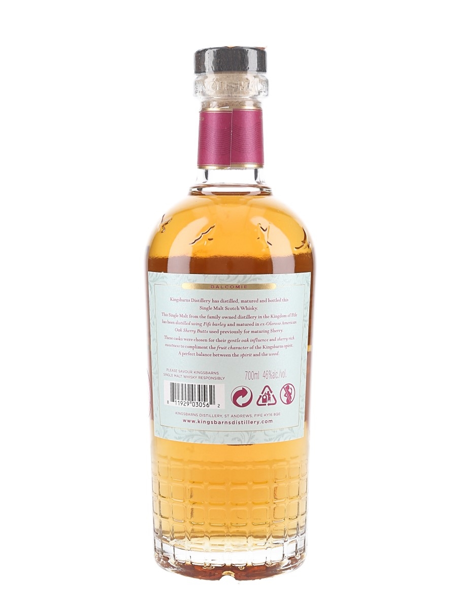 A bottle of Kingsbarns Balcomie Lowland Single Malt Scotch Whisky. This was matured in ex-Oloroso American oak sherry butts and bottled on 4 April 2023.