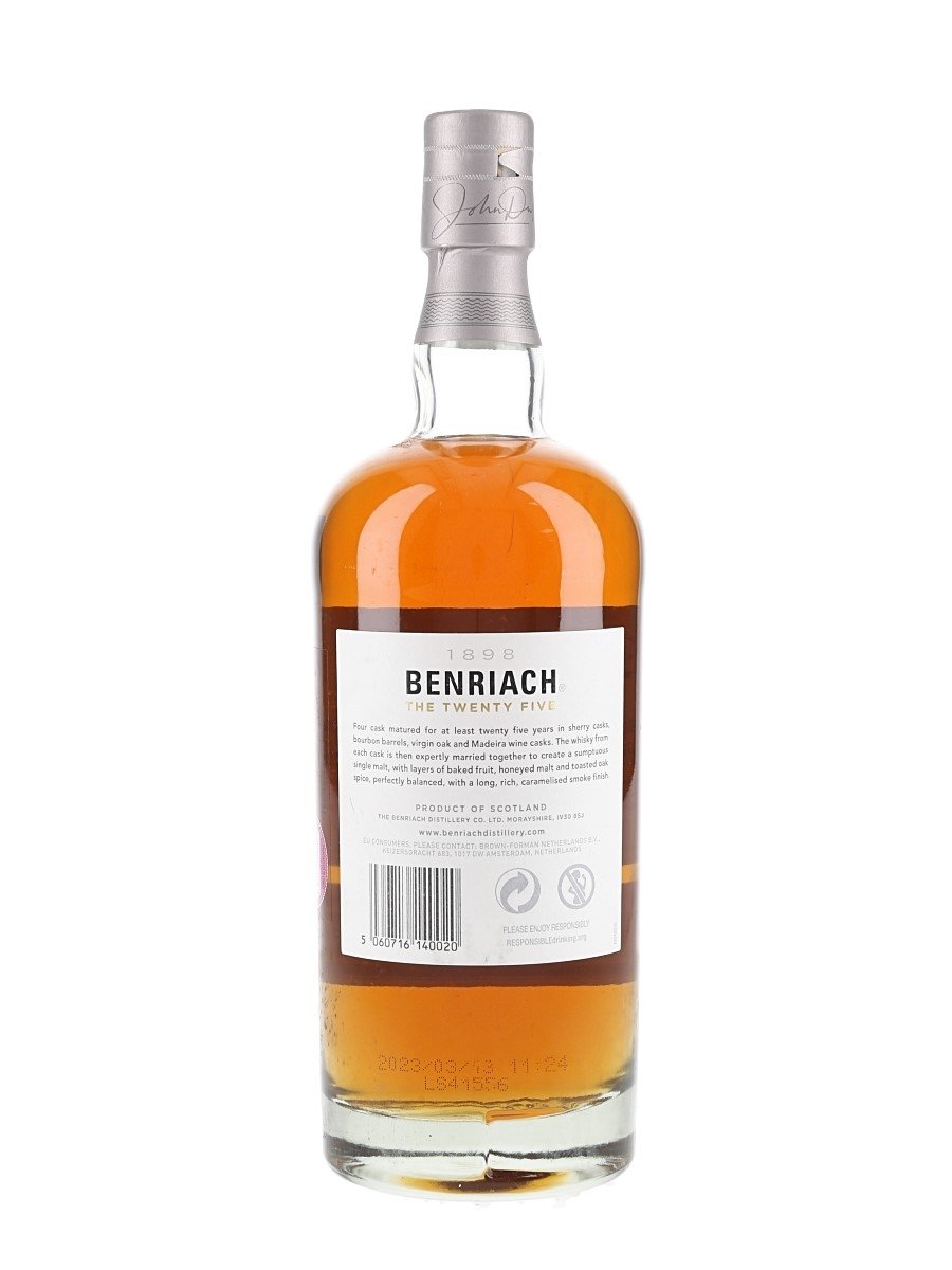 A bottle of Benriach 25 Year Old Single Malt Scotch Whisky. Matured in a marriage of Bourbon, Sherry, Virgin oak and Madeira Wine casks before being bottled on the 14th of March 2023.