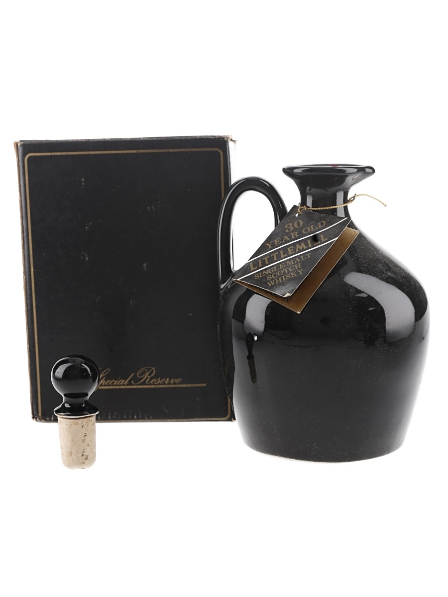 A bottle of Littlemill 30 Year Old Single Malt Scotch Whisky, presented in a ceramic decanter.