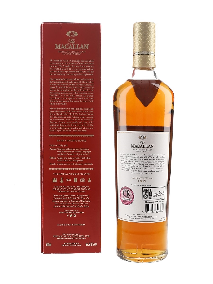 A bottle of The Macallan Classic Cut Limited Edition. This was aged in casks seasoned with oloroso sherry from Jerez, Spain, and bottled at a cask strength of 51.2% ABV by the distillery in 2018.