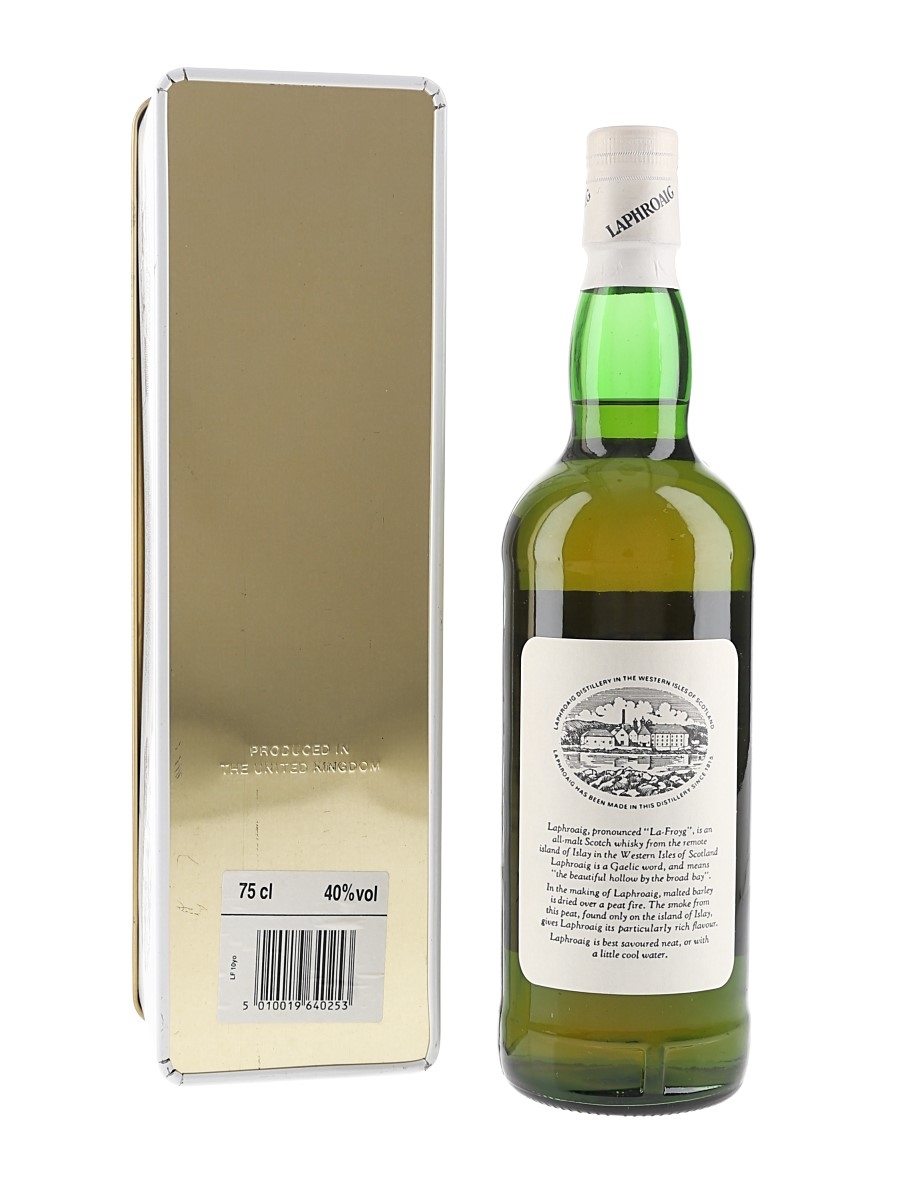 A bottle of Laphroaig 10 Year Old Single Islay Malt Scotch Whisky in a presentation tin We estimate this was bottled in the 1980s, before the distillery was awarded its royal warrant.