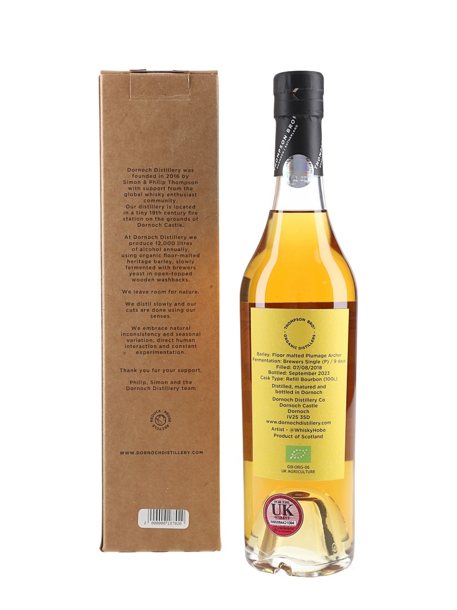 A 50cl bottle of Dornoch Distillery 2018 Single Malt Scotch Whisky. This was distilled on 7 August 2017, matured for 5 years in a 100 litre Refill Bourbon cask and bottled at 57.4% ABV in September 2023.