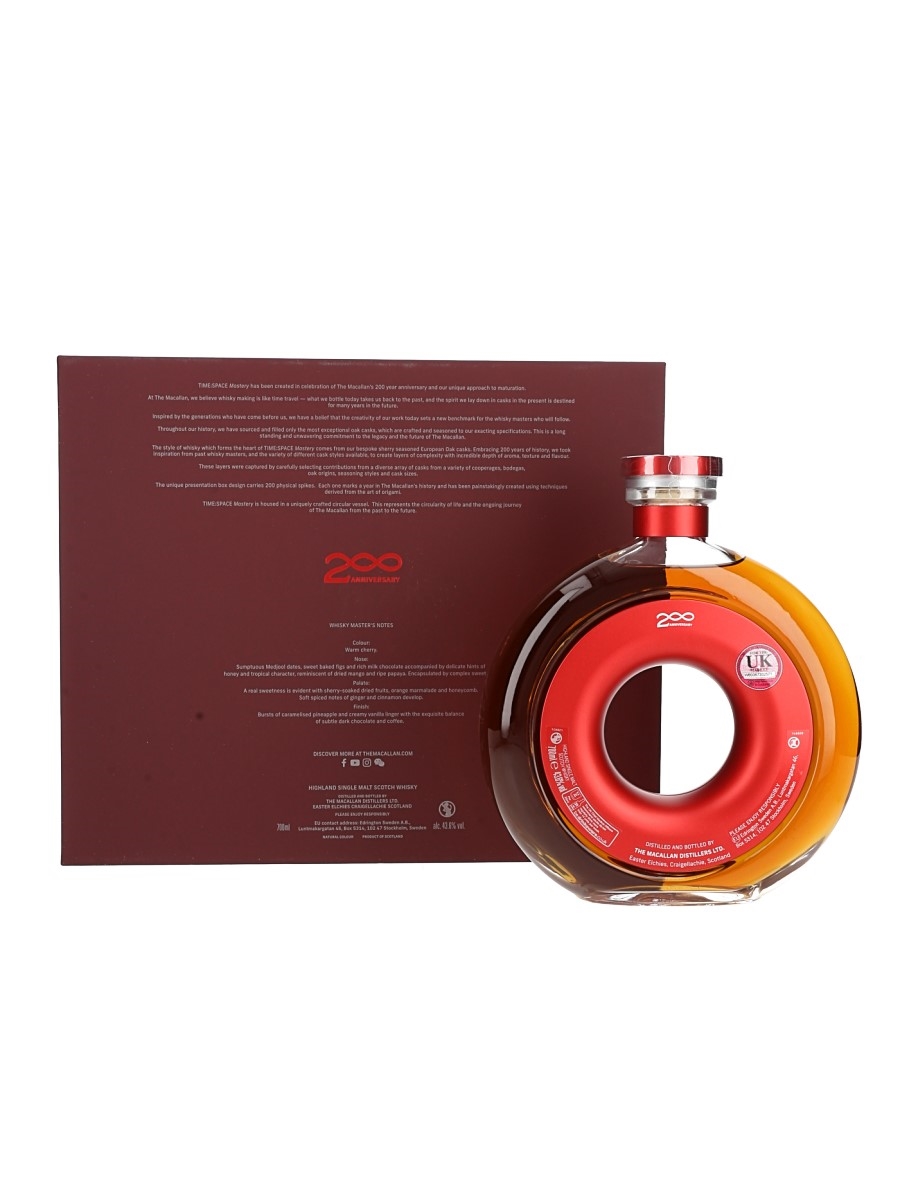 A bottle of The Macallan Time : Space - Mastery. This was released in 2024 to celebrate the 200th anniversary of the Macallan distillery. Fourteen types of cask have been married together, to create this unique Single Malt which celebrates the legacy of Macallan.