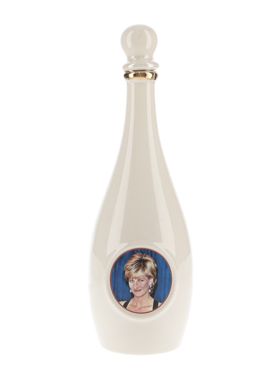 A bottle of Rutherford's single malt Scotch whisky in a ceramic decanter featuring Princess Diana, produced by Montrose Pottery.