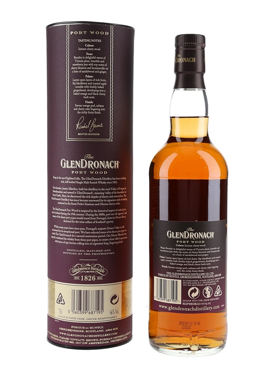 A bottle of The Glendronach Port Wood Highland Single Malt Scotch Whisky, finished in port pipes from Portugal's Douro Valley.