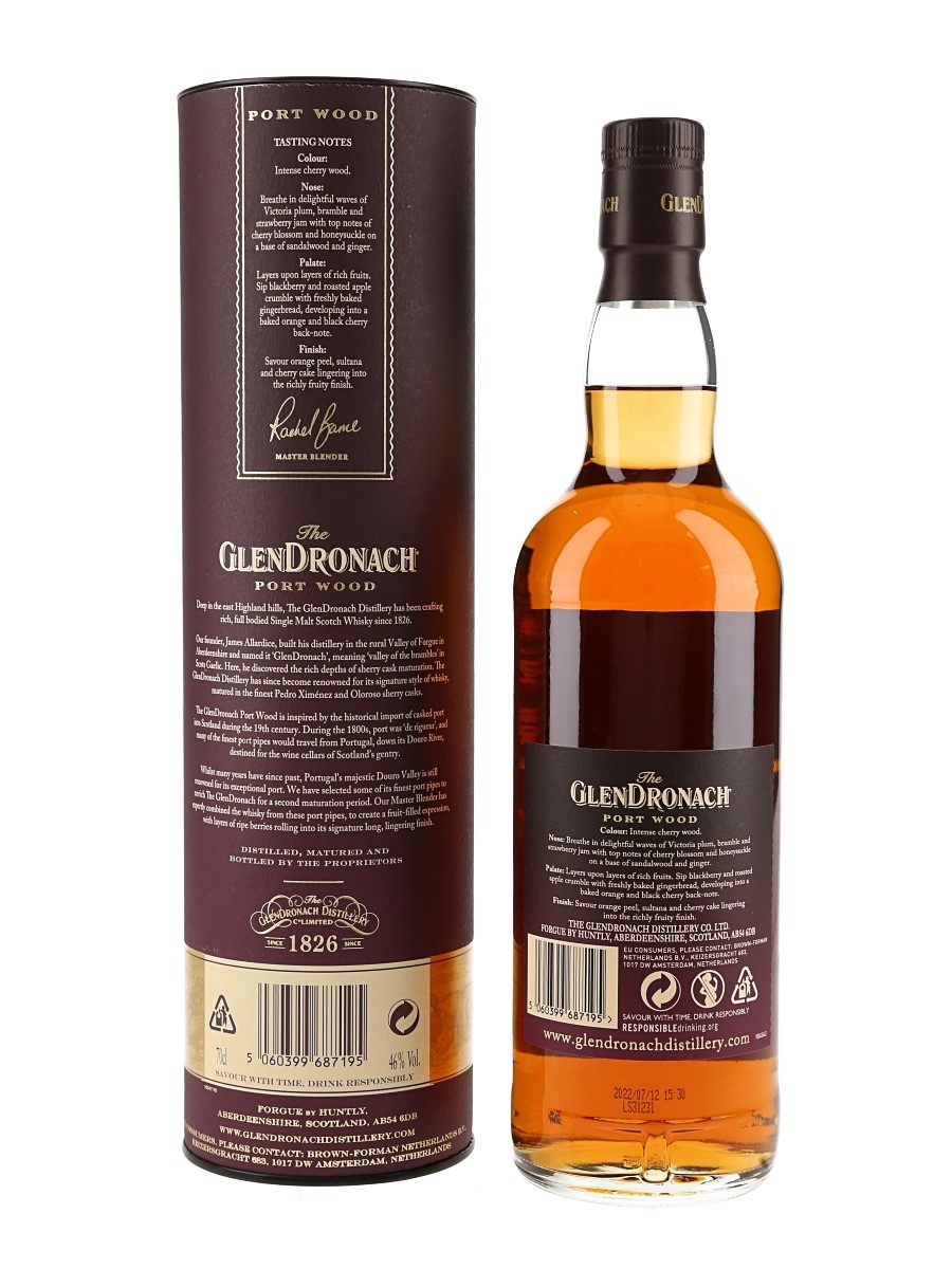 A bottle of The Glendronach Port Wood Highland Single Malt Scotch Whisky, finished in port pipes from Portugal's Douro Valley.