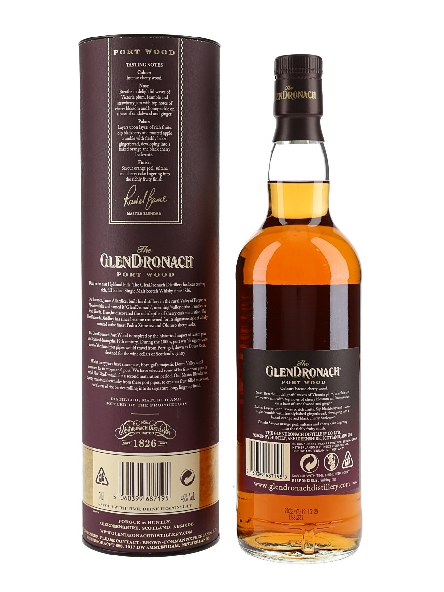 A bottle of The Glendronach Port Wood Highland Single Malt Scotch Whisky, finished in port pipes from Portugal's Douro Valley.