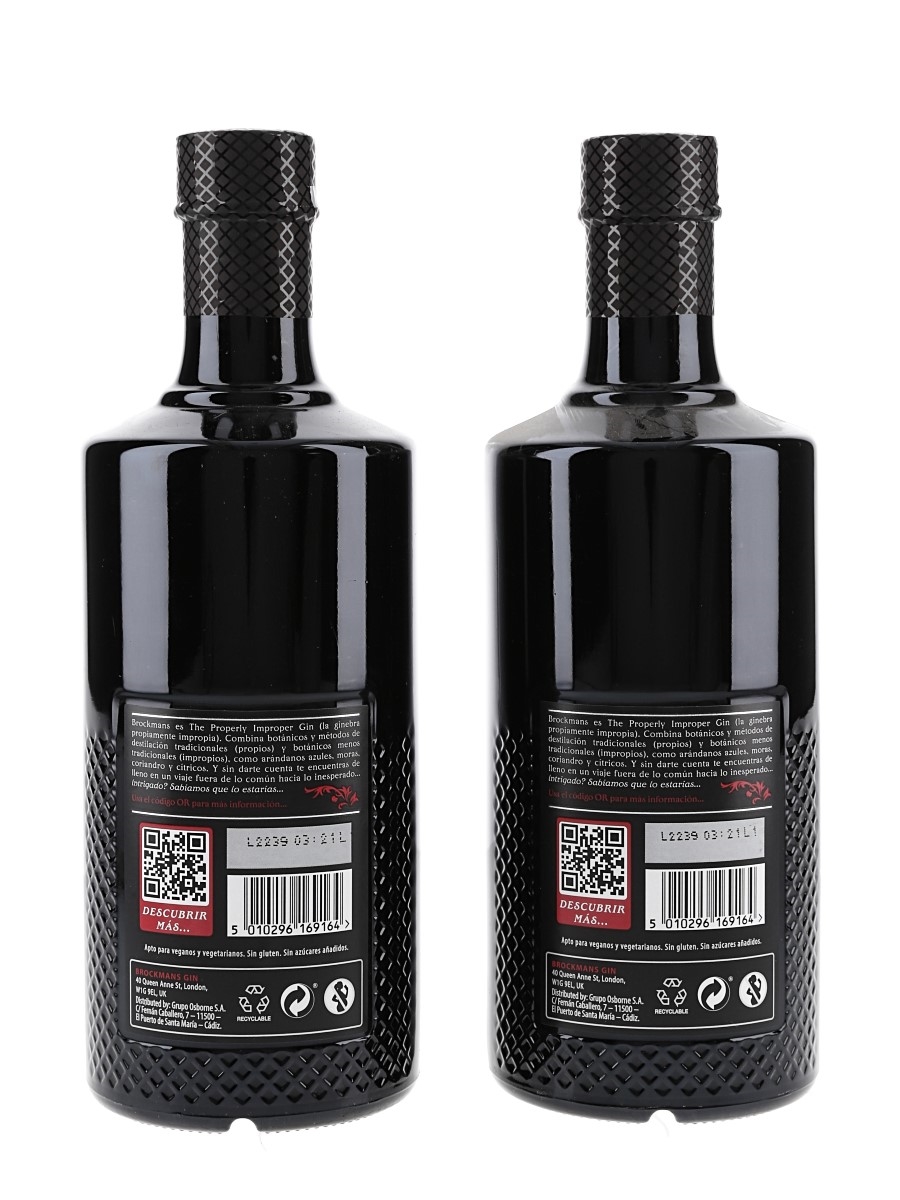 This lot contains two bottles of Brockmans Premium Gin, distilled in England from neutral grain spirit and infused with botanicals.