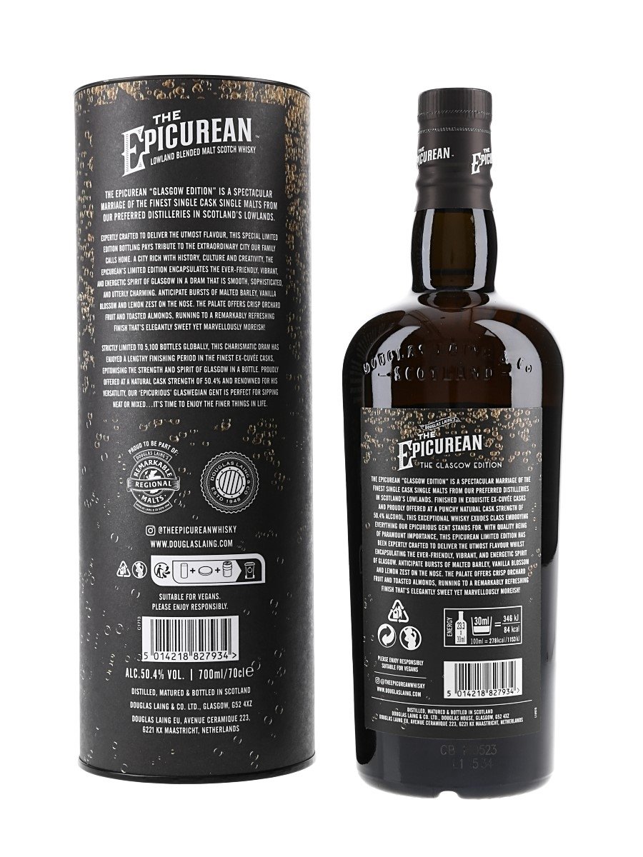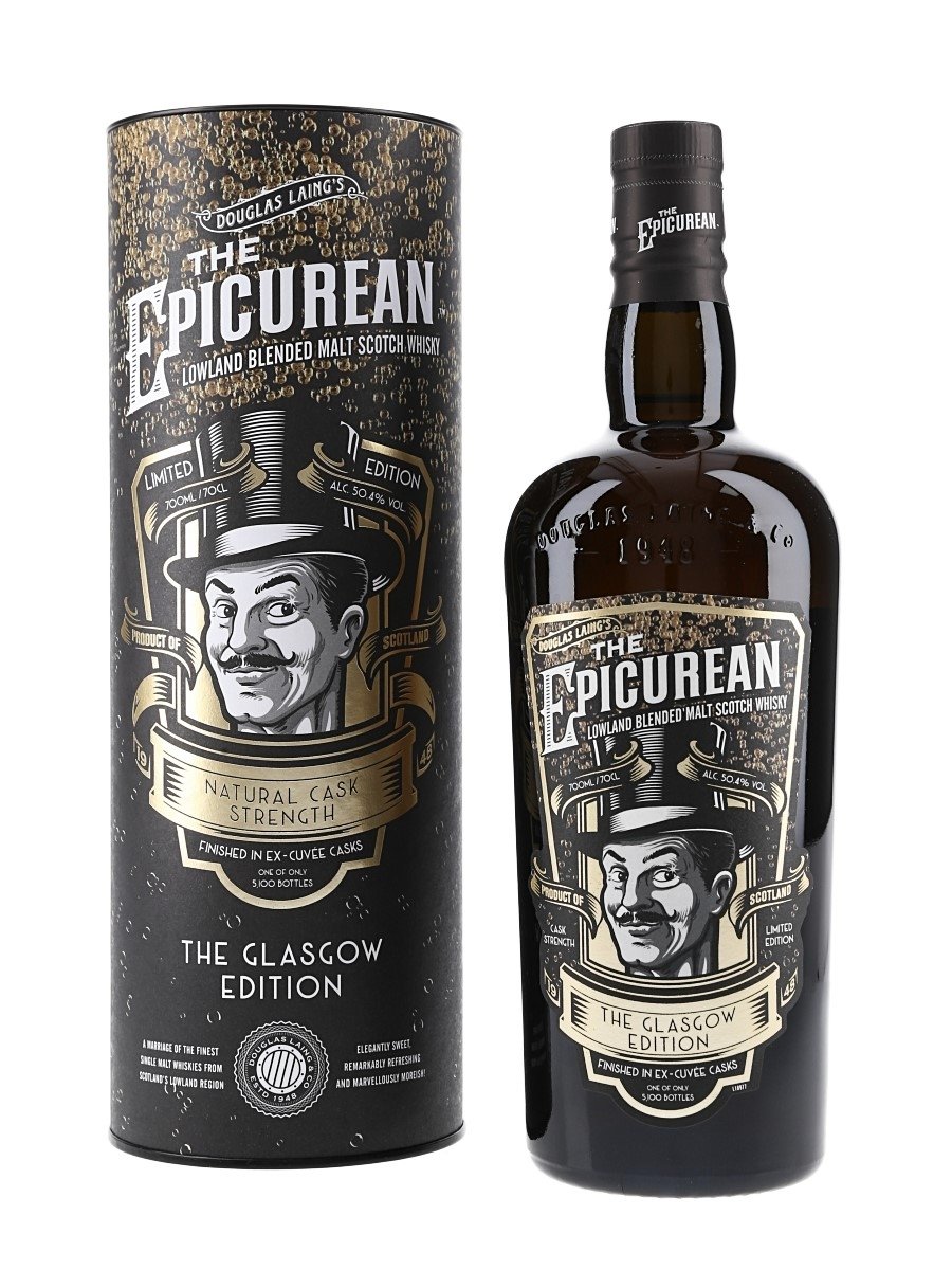 A limited edition bottle of The Epicurean Lowland Blended Malt Scotch Whisky. This Glasgow Edition was bottled at cask strength by Douglas Laing & Co.