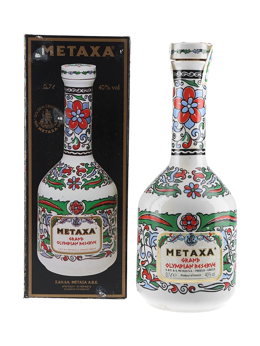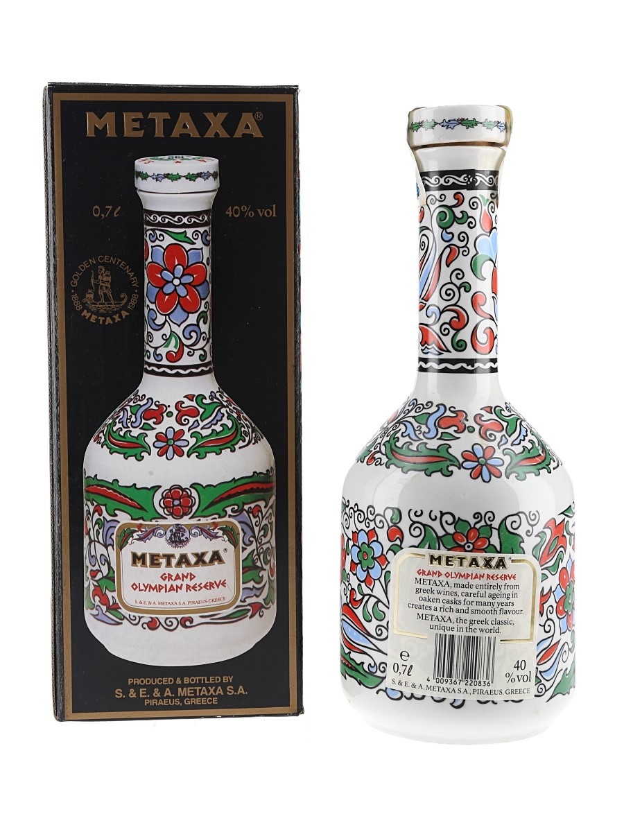 A ceramic decanter of Metaxa Grand Olympian Reserve Greek brandy, released in 1988 for the company's Golden Centenary.