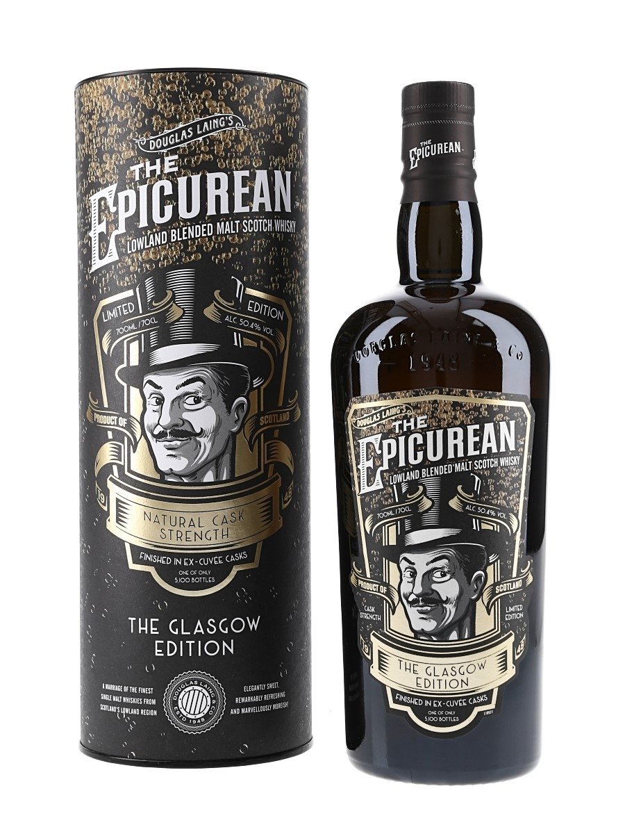A limited edition bottle of The Epicurean Lowland Blended Malt Scotch Whisky. This Glasgow Edition was bottled at cask strength by Douglas Laing & Co.