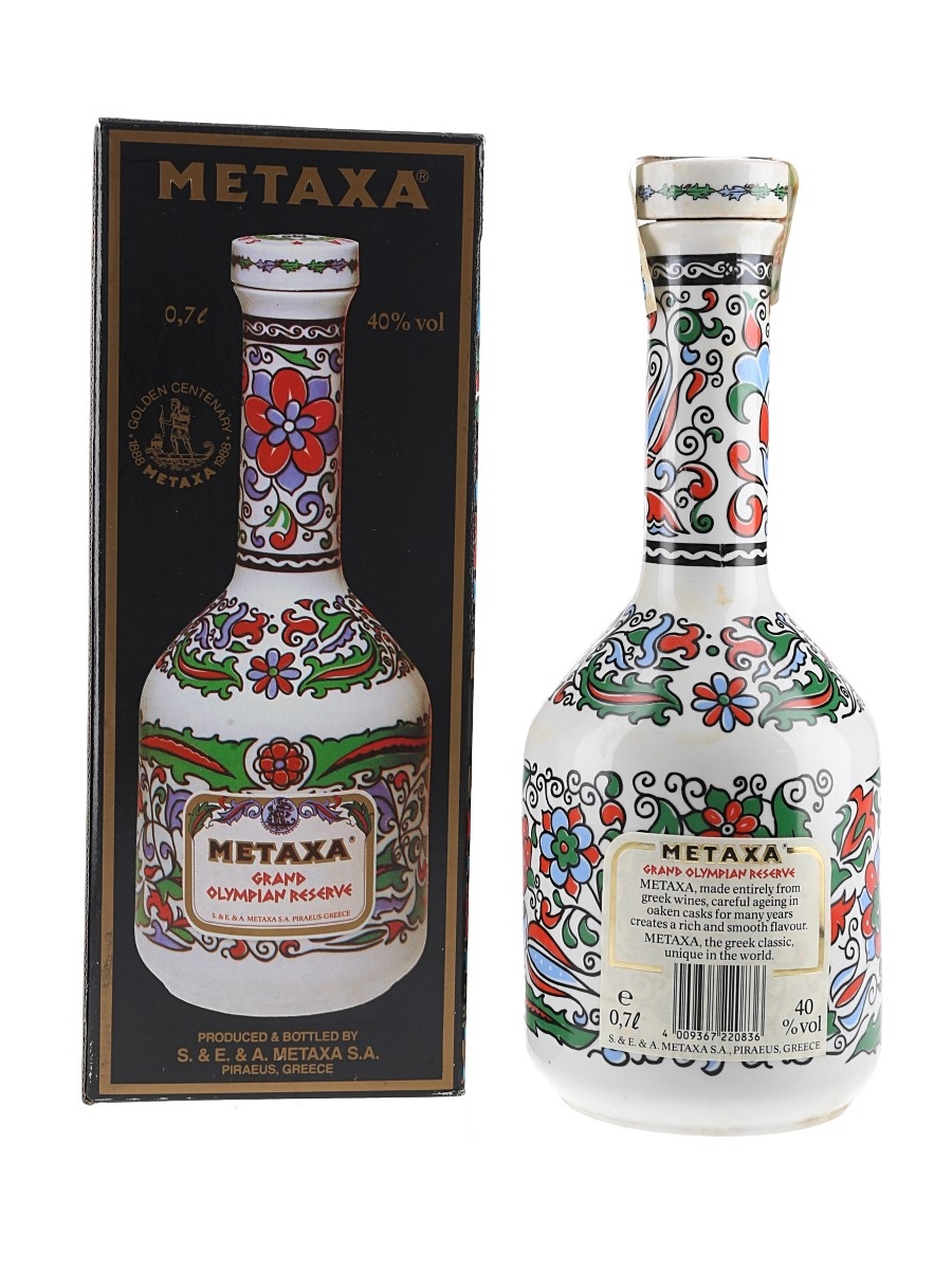 A ceramic decanter of Metaxa Grand Olympian Reserve Greek brandy, released in 1988 for the company's Golden Centenary.