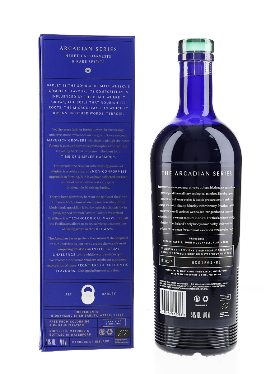 A bottle of Waterford Luna 1.1 Biodynamic Irish Single Malt Whisky, the world’s first whisky made from biodynamic barley. The barley for this whisky was harvested in summer 2017.This was distilled in 2018, matured for 3 years, 2 months, 1 day and bottled at 50% ABV on 4 September 2021 as part of the Arcadian Series.