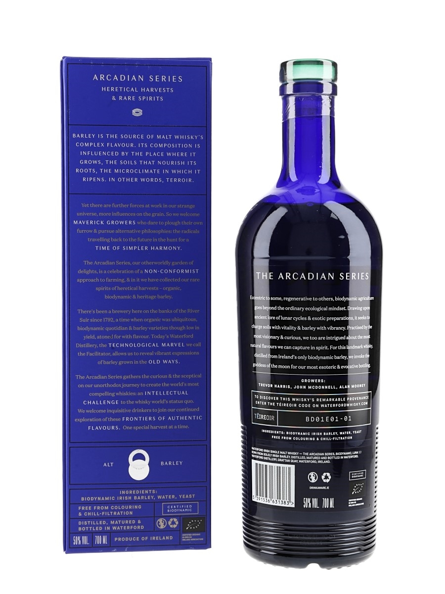 A bottle of Waterford Luna 1.1 Biodynamic Irish Single Malt Whisky, the world’s first whisky made from biodynamic barley. The barley for this whisky was harvested in summer 2017.This was distilled in 2018, matured for 3 years, 2 months, 1 day and bottled at 50% ABV on 4 September 2021 as part of the Arcadian Series.