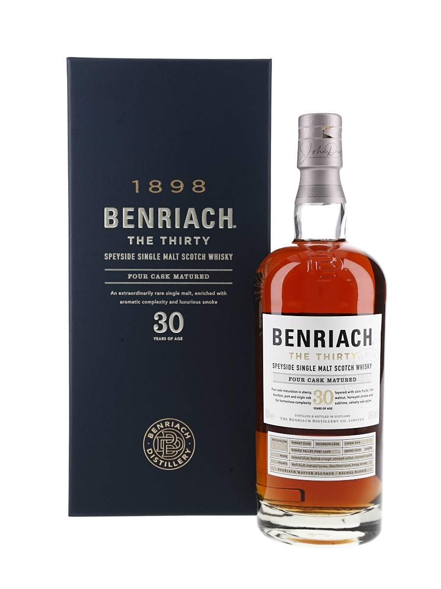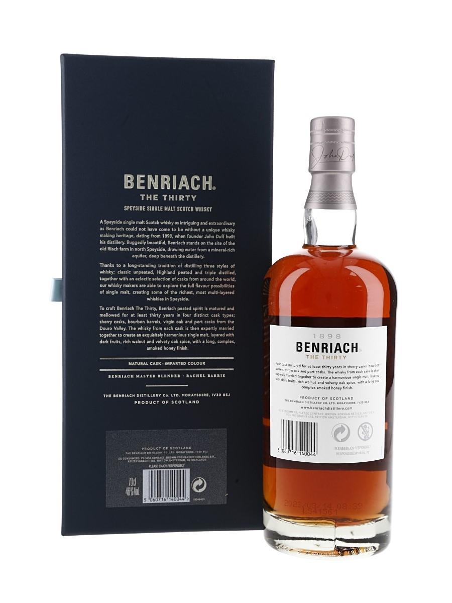 A bottle of Benriach 30 Year Old Four Cask Matured Single Malt Scotch Whisky. This is a mixture of four casks including Sherry, Bourbon, Port and Virgin Oak, aged for 30 years and married together. The bottling code indicates this was bottled in 2023.