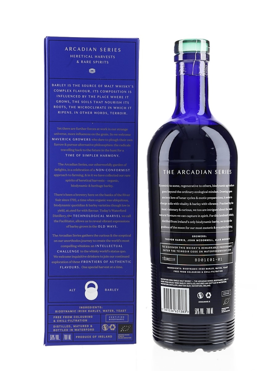 A bottle of Waterford Luna 1.1 Biodynamic Irish Single Malt Whisky, the world’s first whisky made from biodynamic barley. The barley for this whisky was harvested in summer 2017.This was distilled in 2018, matured for 3 years, 2 months, 1 day and bottled at 50% ABV on 4 September 2021 as part of the Arcadian Series.