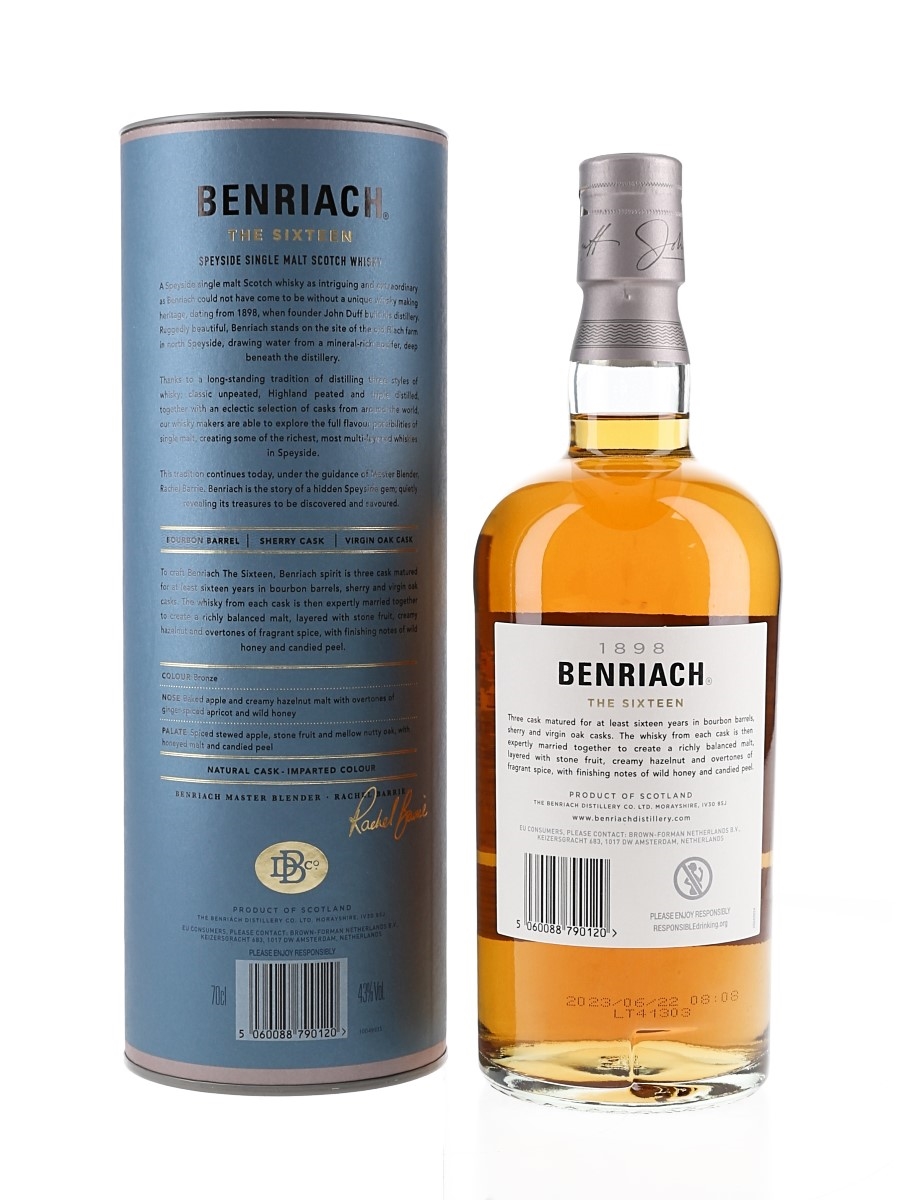 A bottle of Benriach 16 Year Old Three Cask Matured. The bottling code indicates this was bottled in 2023.