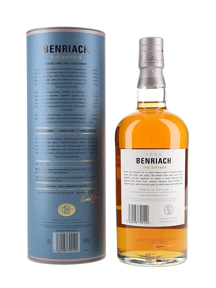 A bottle of Benriach 16 Year Old Three Cask Matured. The bottling code indicates this was bottled in 2023.