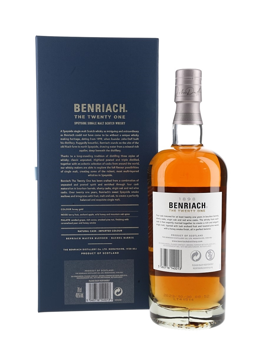 A bottle of Benriach 21 Year Old Single Malt Scotch Whisky. Matured in Bourbon, Virgin Oak, Sherry Oak and Red Wine casks and bottled in 2023.