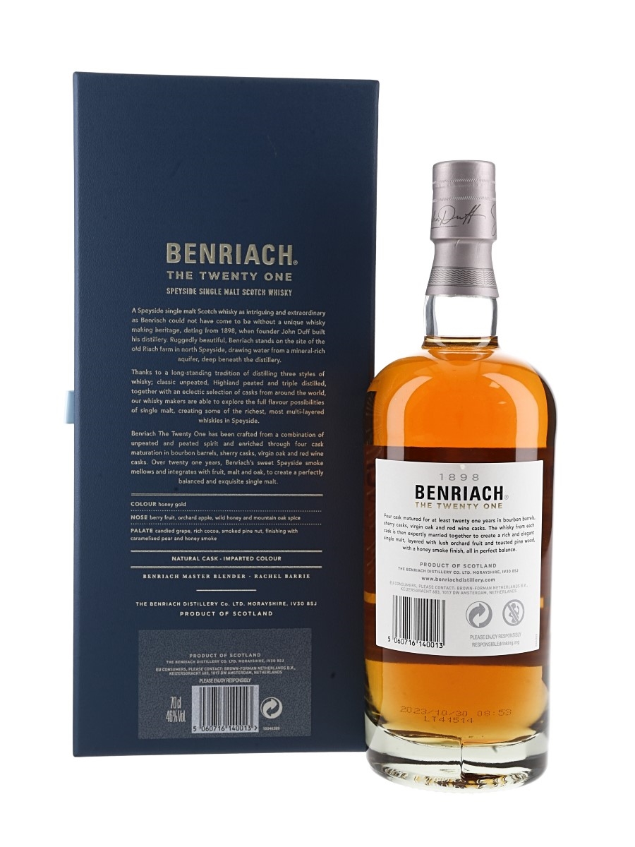 A bottle of Benriach 21 Year Old Single Malt Scotch Whisky. Matured in Bourbon, Virgin Oak, Sherry Oak and Red Wine casks and bottled in 2023.