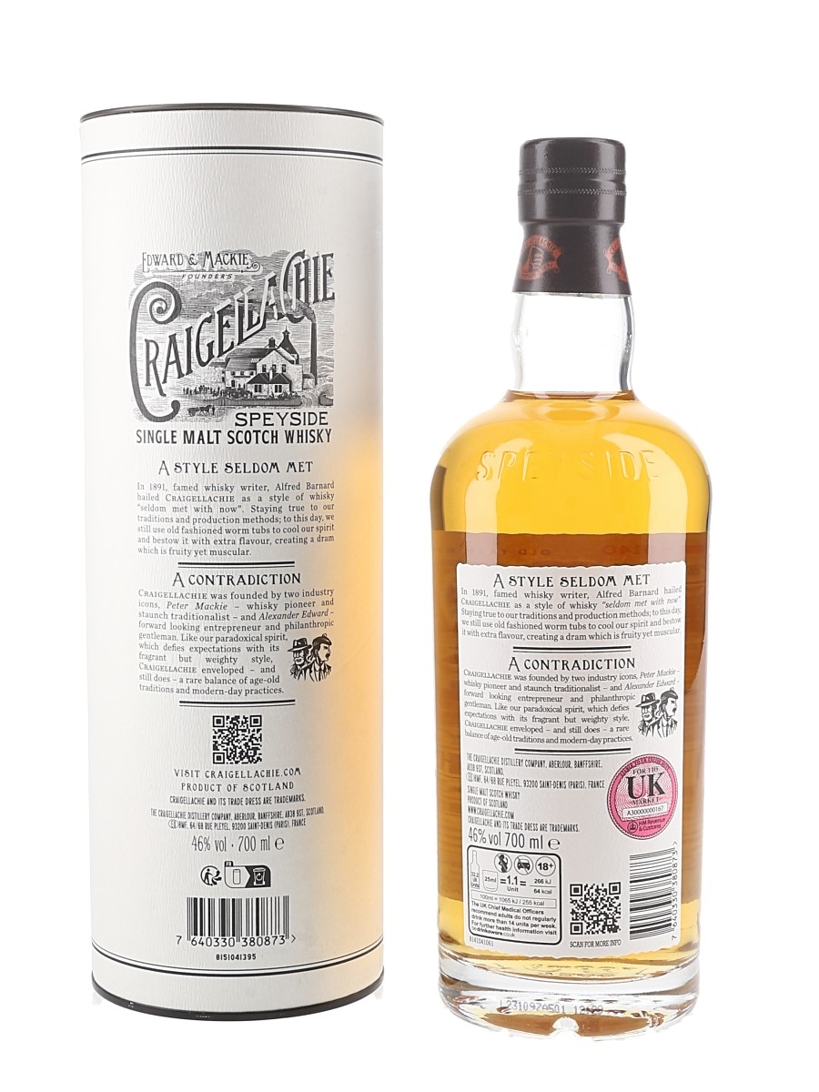 A bottle of Craigellachie 19 Year Old Speyside Single Malt Scotch Whisky, bottled from batch number 04-6140.