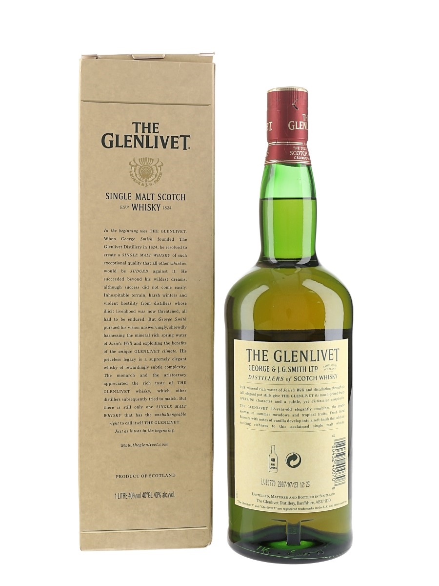 A bottle of The Glenlivet 12 Year Old Single Malt Scotch Whisky. The bottling code indicates that this was bottled in 2007.