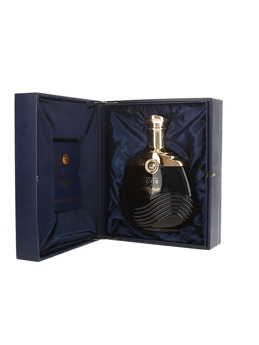 A bottle of Martell L'Or Cognac, a blend of eaux-de-vie from the Grande Champagne, Petite, Champagne and Borderies growing regions, with an average age of 60 years. This is presented in a crystal decanter decorated in 24 carat gold with a wave motif inspired by Cognac's undulating vineyards.